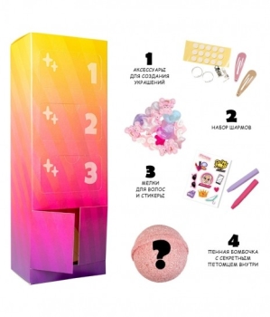 В наборе есть все, чтобы повторить образ любимой куклы и сделать игровой процесс интересным: шармы, из которых можно сделать множество аксессуаров, мелки для волос, яркие стикеры, а также сюрприз в виде пенной бомбочки с секретным питомцем внутри!