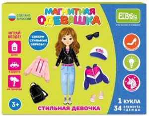 "Магнитная игра-одевашка «Стильная девочка» - увлекательное занятие для вашего ребенка. В наборе фигурка куколки и различные элементы одежды. Предложите малышу одеть героиню самостоятельно.