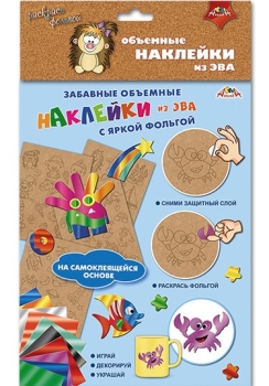 Набор для творчества. Объемные наклейки из ЭВА "Раскрась фольгой". В наборе лист мягкого пластика EVA размером 18 х 23 см. Лист толщиной 2 мм имеет клевой слой с двух сторон. На листе высечены фигурки . Также в наборе разноцветные листы фольги размером 10 х 10 см и пластиковый стилус. Сними защитный слой с фигурки, приложи к клеевому слою цветную фольгу (цветной стороной вверх), прижми фольгу стилусом получится раскрашенная фольгой объемная наклейка. Упаковка - ПЭТ пакет с картонным европодвесом.