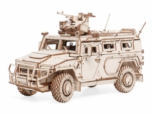У собранной модели открываются двери, люки стрелковой платформы на крыше, окна и капот. Вращаются и снимаются колеса, передние колеса поворачиваются, вращаются пушки. Конструктор можно раскрасить акриловыми красками!