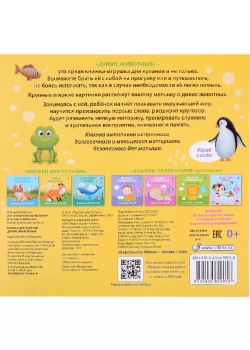 «Дикие животные» – это яркая книжка-игрушка для купания и не только. Вы можете брать её с собой на прогулку или в путешествие, не боясь испачкать, так как в случае необходимости её легко помыть.