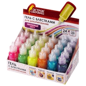 Гель с блёстками ОСТРОВ СОКРОВИЩ - это блестящие наборы для творчества и декорирования поделок из бумаги, картона, дерева, пластика и других материалов. Удобный наконечник с дозатором позволяет легко наносить гель на любую поверхность.