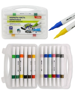 Маркеры акриловые 12шт 24 цв кисть 1-4 мм на водной основе двусторонние