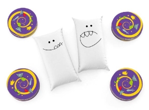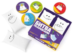 В состав настольной игры «Битва подушками» входит: 2 мини-подушки, 56 карточек персонажей, правила игры.