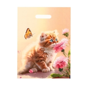 Пакет полиэтиленовый с вырубной ручкой Котенок с цветами 30х40 см 50мкм