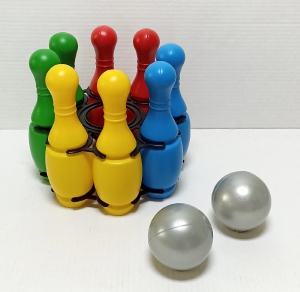 Боулинг. Набор кегли 20 см 8 штук+2 шара 7 см в держателе