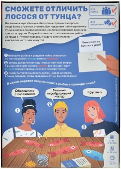 Настольная игра “Чешуя себе” полна странных вопросов и ещё более странных ответов. Вам предстоит найти одинокого тунца в косяке лживых лососей, исключив пафосных врунишек одного за другим. Получайте очки за то, что выловили рыбок из пруда в нужном порядке, и будьте внимательны – иногда они не то, чем кажутся!