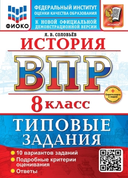 Данное пособие полностью соответствует федеральному государственному образовательному стандарту. Книга содержит 10 вариантов типовых заданий Всероссийской проверочной работы (ВПР) по истории для учащихся 8-х классов. Сборник предназначен учащимся 8-х классов, учителям и методистам, использующим типовые задания для подготовки к Всероссийской проверочной работе по истории. Я. В. Соловьёв - кандидат исторических наук, доцент кафедры истории России Государственного университета просвещения, старший научный сотрудник Научно-просветительского отдела Государственной публичной исторической библиотеки России, автор пособий по истории России, ЕГЭ, ОГЭ и ВПР.