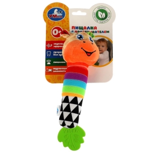 Эта игрушка в виде милого жирафика выполнена из очень мягкого и гипоаллергенного материала красочной расцветки. При нажатии игрушка издаёт забавный пищащий звук, а если её потрясти - весело загремят шарики, надежно спрятанные внутри. Прорезыватель интересной формы из качественного безопасного материала пригодится малышу, когда у него будут резаться зубки.